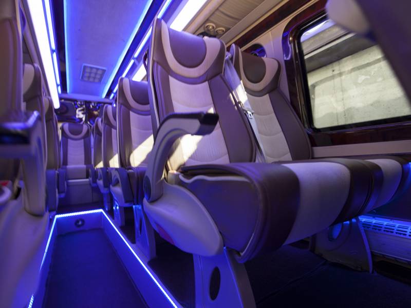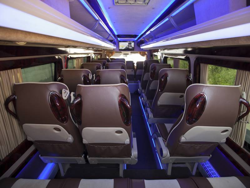 Индивидуальный кондиционер и подсветка (разводка для каждого пассажира), установлена дополнительная печка (актуально в зимний период), люк, телевизоры (в салоне и у водителя), DVD, аудио-система, микрофон, 2 режима освещения салона. Окна в микроавтобусе тонированные, также есть шторки.