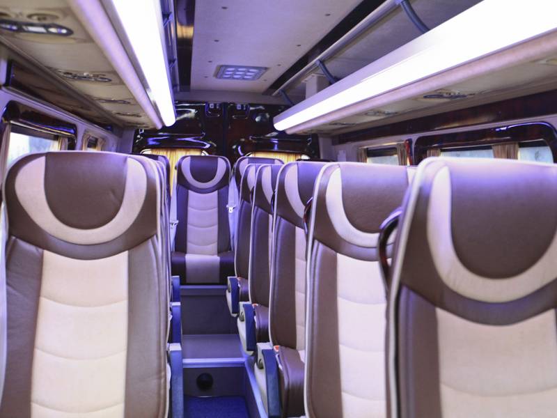 Индивидуальный кондиционер и подсветка (разводка для каждого пассажира), установлена дополнительная печка (актуально в зимний период), люк, телевизоры (в салоне и у водителя), DVD, аудио-система, микрофон, 2 режима освещения салона. Окна в микроавтобусе тонированные, также есть шторки.